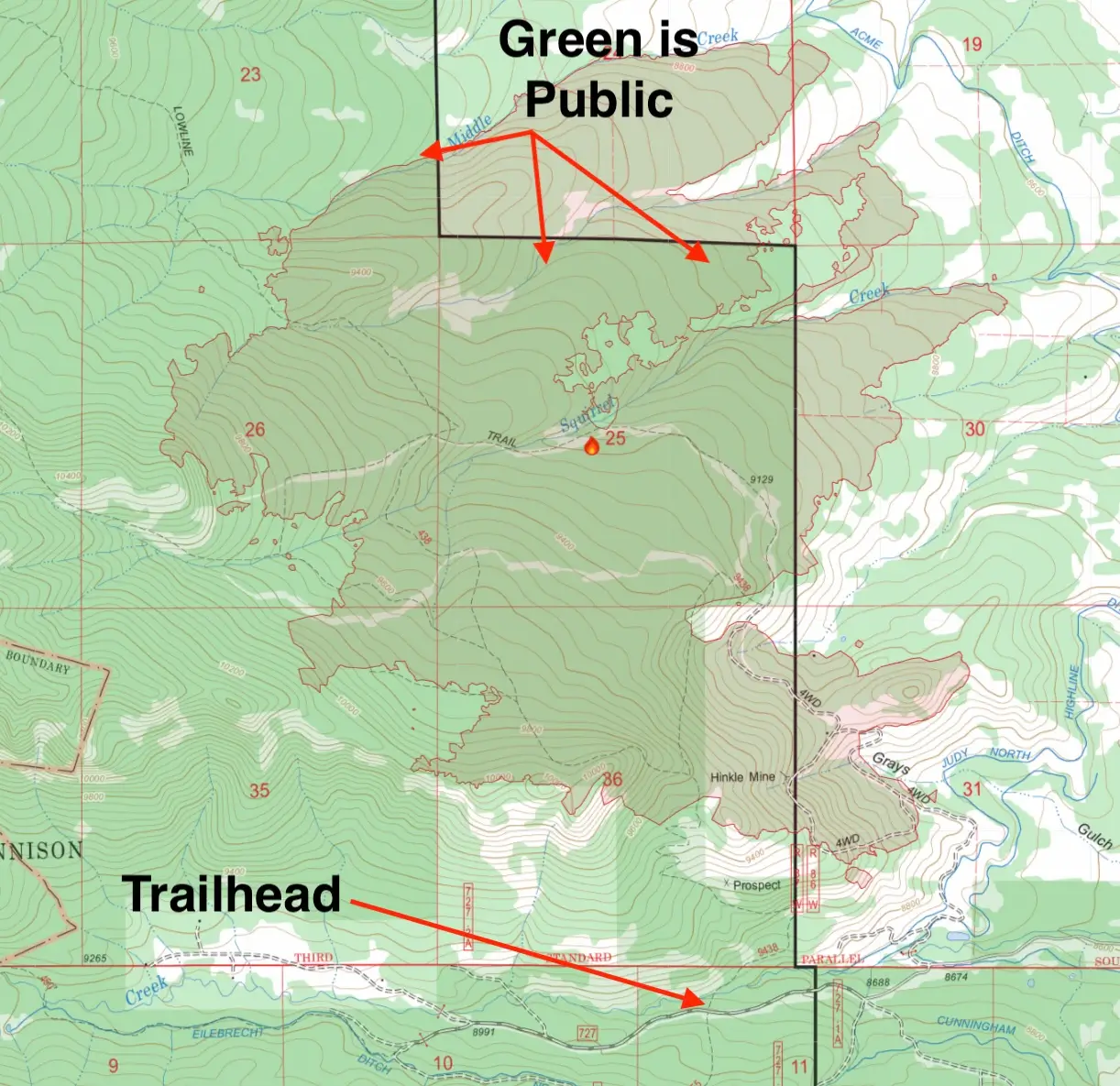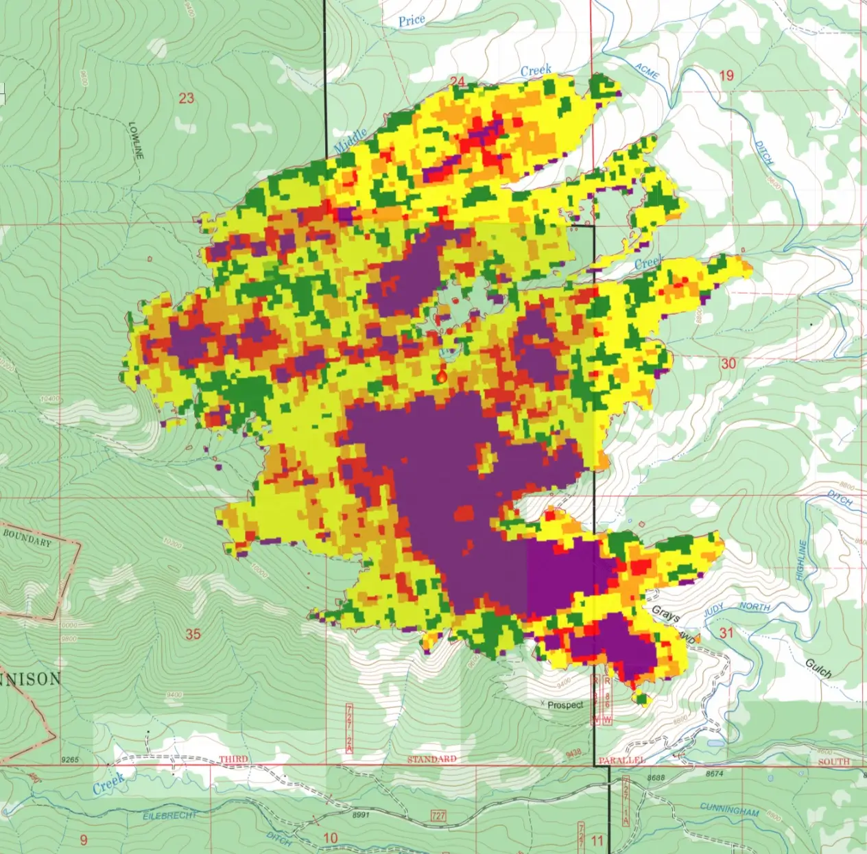 Sometimes you have to hike in because of private property. The Lowline fire in Colorado is a great example. It has a lot of territory in the 9-10K range. The fire is 1900 acres and 1850 of that is forested. However 600 acres are private, including the access roads. We report total acreage, forested acreage, public acreage and elevation range for each burn.