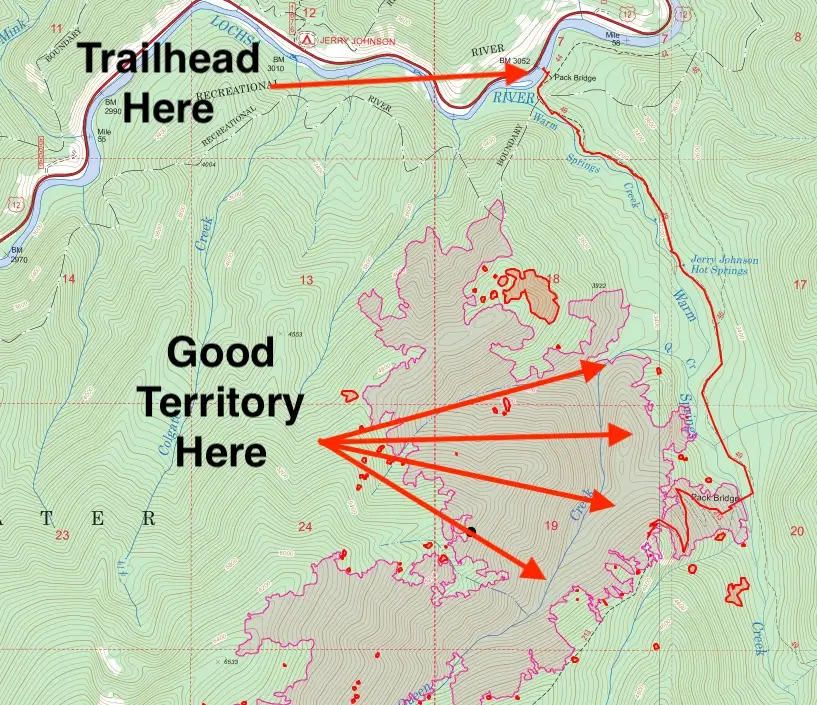 The Little Bear Fire (and nearby West Fork Fire) in Idaho is a good example – we rated it a “C” fire even though it is 1200 acres and has some nice forest.  To access there is a several mile hike on Foot Trail #49 (Clearwater National Forest). This is the same foot trail to the Jerry Johnson Springs.