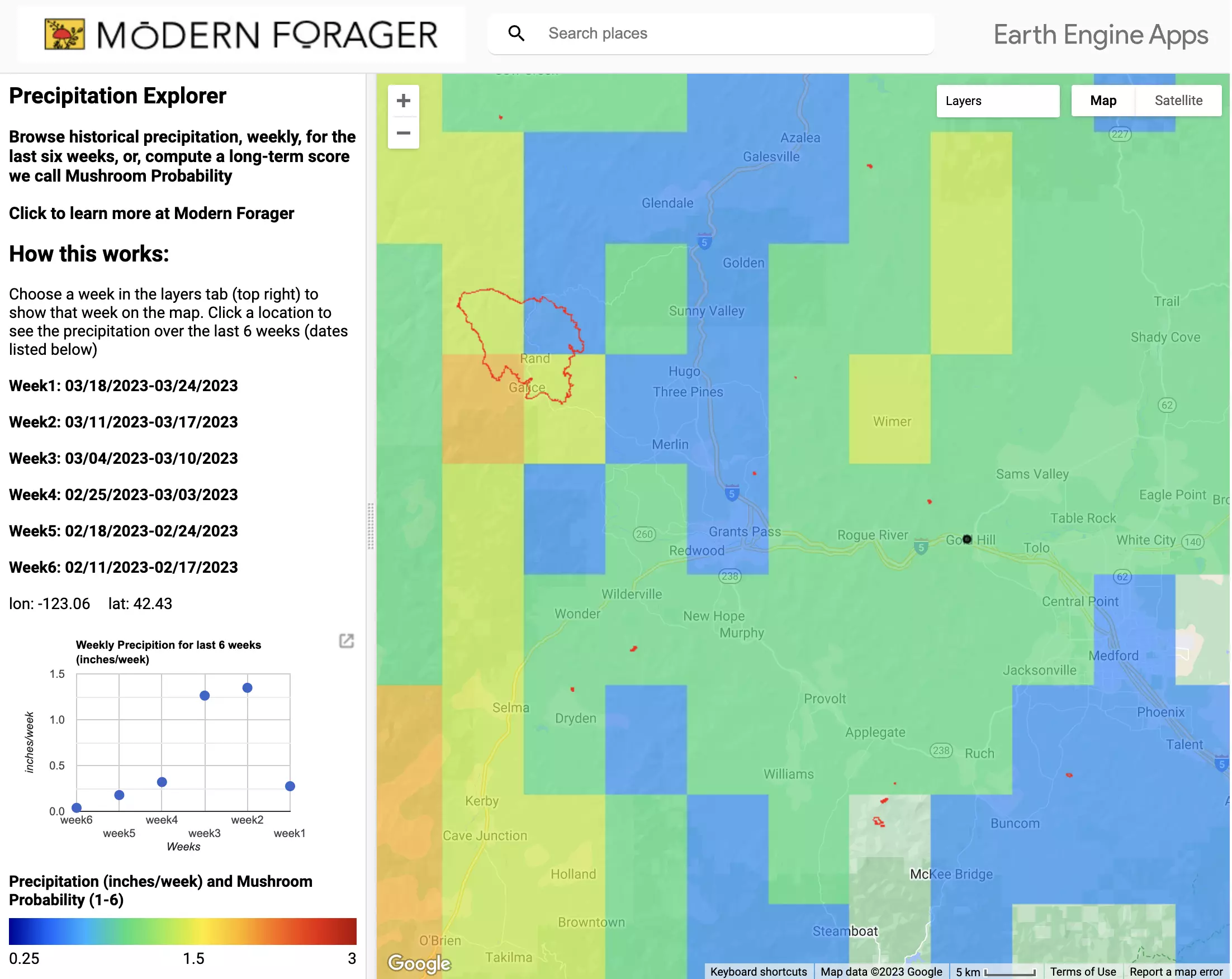 Here’s a shot near Gold Hill OR where spring natural morels should be starting. Notice opacity has been set to about half so we can see where we are! The left panel shows the precipitation during the last six weeks, organized by week, for the spot we clicked (the black dot). The color overlay, predicts the calculated probability zones based on a six week score: a perfect score (red) requires 1 inch of rain each week for six weeks. This spot has a score of 1 out of 3 based on the last six weeks of data. The user can also show a color overlay for just one week, choosing from any of the past six weeks.